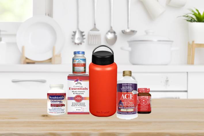 a selection of all-natural supplements and a metal water bottle
