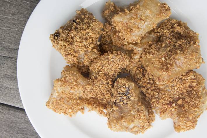 Remove the mochi, dip each piece in the hot syrup and then roll in ground almonds. Serve immediately.