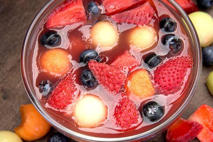Place the sliced fruit and berries in a serving dish. Pour the hot juice over it. Set aside on the counter or a cool place until gelled, about 1 to 1 1⁄2 hours.