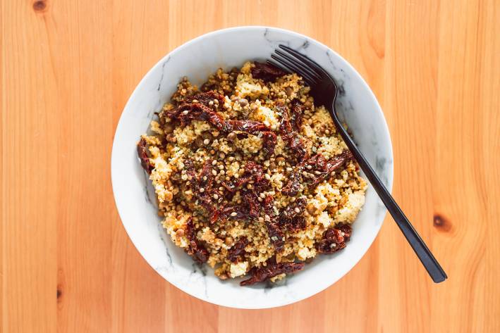a bowl of couscous with lentils and veggies