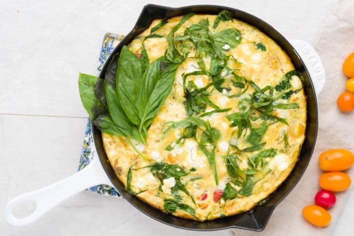 In a medium-sized cast iron skillet, add the avocado oil, spinach, and chopped tomatoes and set aside.