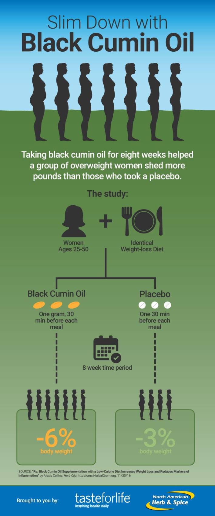 The women, ages 25 to 50, took one-gram capsules of black cumin oil or a placebo 30 minutes before each meal for a total of three grams daily. Those in the black cumin group lost about 6 percent of their body weight in eight weeks, while the control group lost about half as much.