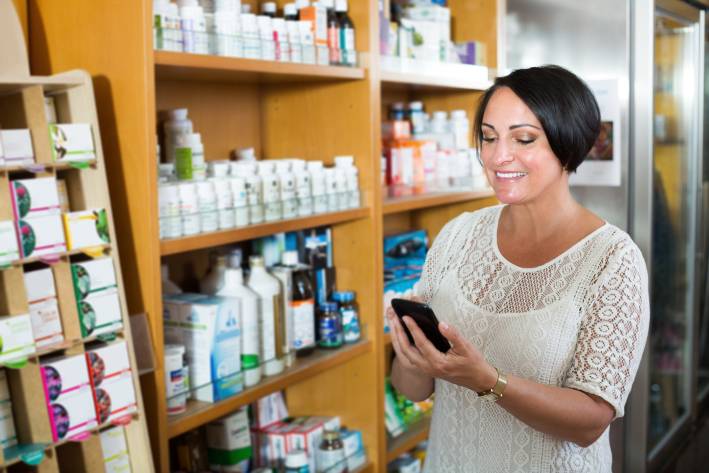 A woman looking up info on her phone while choosing a probiotic supplement.